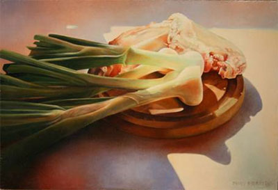 Onions on a Cutting Board, 1980, oil on board, 12x 18 inches