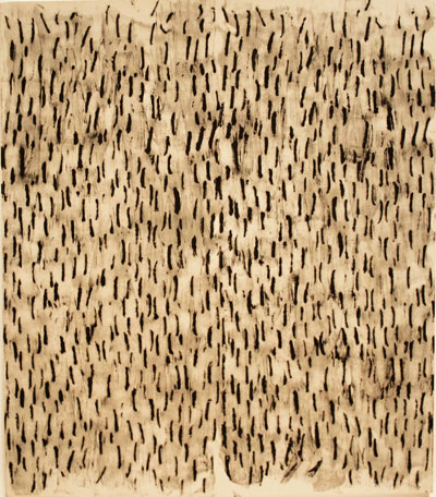 "In going through older rolls of paintings before heading to my studio I came across a chain painting on unprimed canvas. I started frottaging chain on canvas before discovering house painters’ drop cloths as a support for the 2002-2003 Drop Cloth Paintings. After looking at the painting for several days I decided to pursue frottaging the same chain in vertical rows with black paint on unprimed canvas. For the length of chain I had, if abutted in vertical, parallel rows, it would take two passes with a roller for to complete a 48” x 48” canvas and two passes plus a bit more for a 48”x 55” canvas [repeated to build up the surface]. I did numerous vertical chain paintings, many of which I threw away.