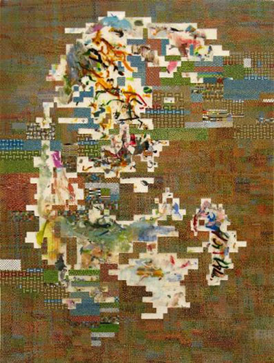 Stebbins summarizes his work in his statement as follow: “While my work shares the labour-intensity of many traditional crafts, it is distanced from them through the act of representation: knitting, stitching, weaving and embroidery have been translated into the languages of painting and drawing. At the same time, the work refuses to be read as straight painting: paint strokes outlined in ink have become caricatures of gesture, fractured picture elements. Similarly, while the pixel mosaics and glitches of electronic imagery are evoked throughout, the work’s connection to digital processes is by metaphor alone. Just as one’s gaze is denied a place to rest within these densely packed images, the elements of these compositions similarly refuse to sit still. These are pictures in flux, caught in the moments of transition.