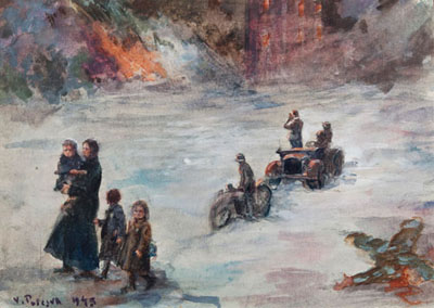 Yidel Podeswa: Early times in The War (Burning Synagogue), watercolour on paper, 1945, 5” x 7”
