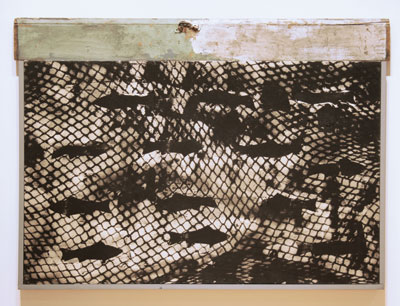 Gerald Ferguson Fish and Net with Moulding, 1992, enamel on canvas with board 41 x 55 inches