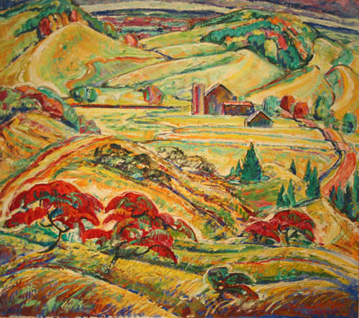In the late summer of 1948 McCarthy travelled to Maine where she was interested in a number of artists working in higher key colours. On a late October sketching trip she put the new colours to test in a number of powerful paintings including Farm in the Dagmar Hills, Ontario. She exhibited the work from this period at the Art Gallery of Hamilton in the winter of 1949.